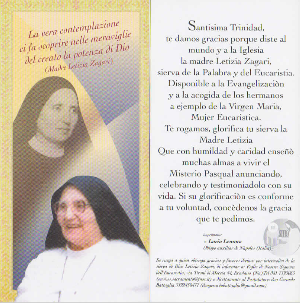 Meditiamo gli insegnamenti semplici e umili della nostra madre Fondatrice per crescere nell’amore a Gesù Risorto e vivo nell’Eucaristia, nella Parola, nella Chiesa, nei poveri e nei piccoli. "Madre Letizia"